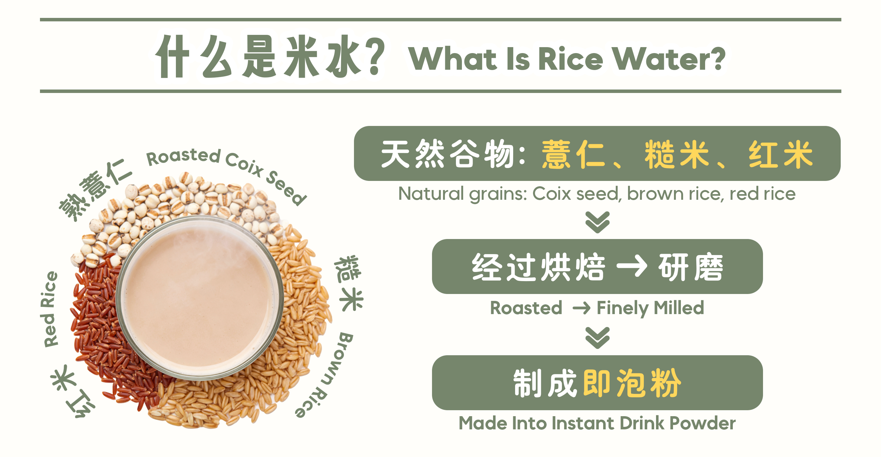 Rice Water is made from red rice, brown rice, and fried raw barley—neutral grains that strengthen the spleen and reduce dampness. Gentle and nourishing, it’s suitable for all ages and supports daily digestive health.