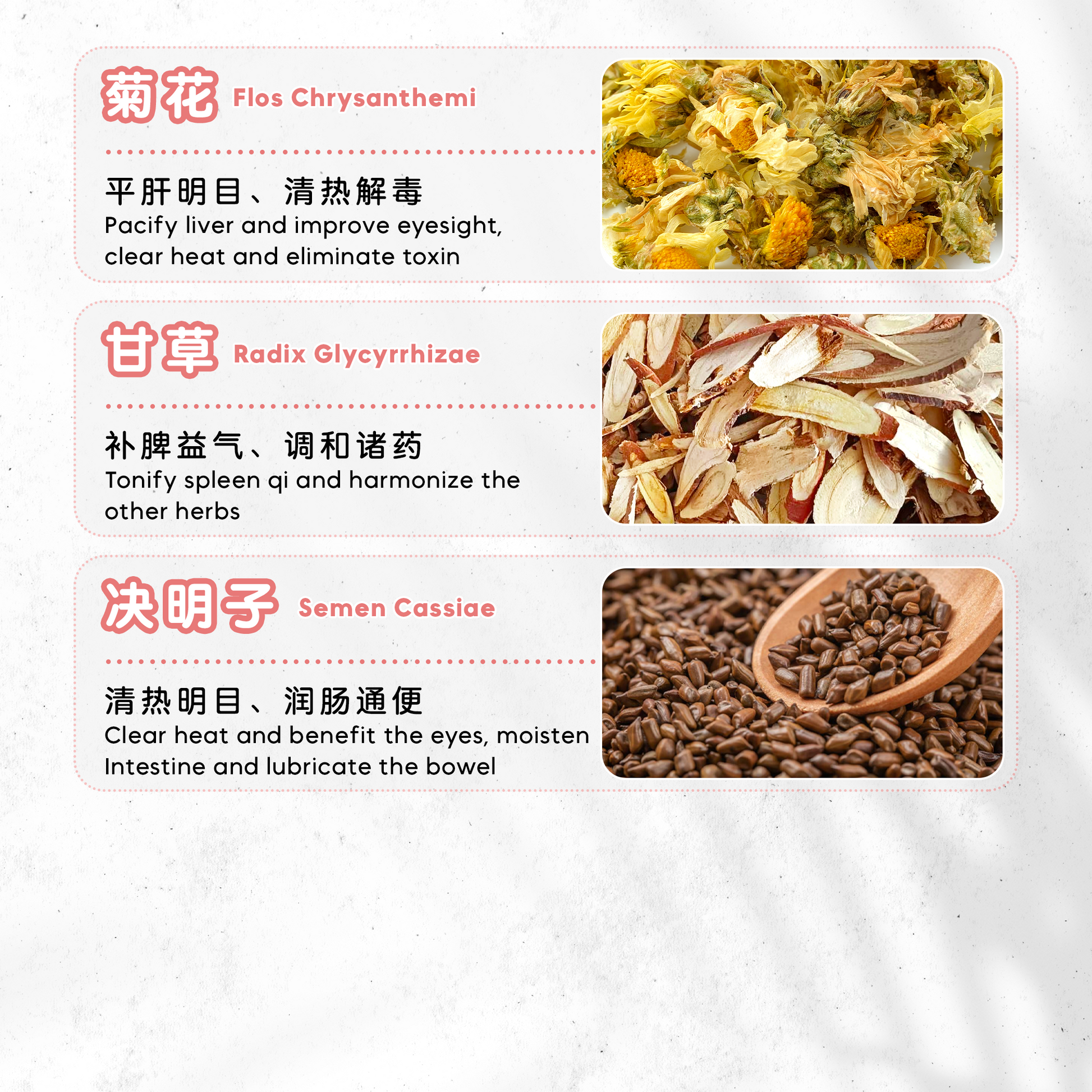 Disperse Wind-Heat, pacify Liver and improve eyesight, clear Heat and eliminate toxin