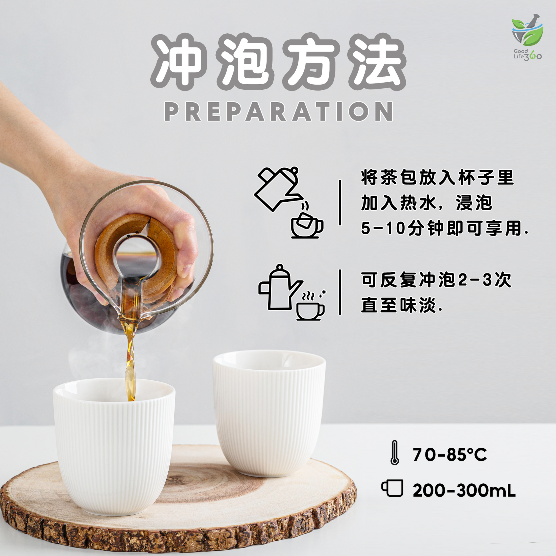 将茶包放入杯子里,加入热水, 浸泡5-10分钟即可享用。